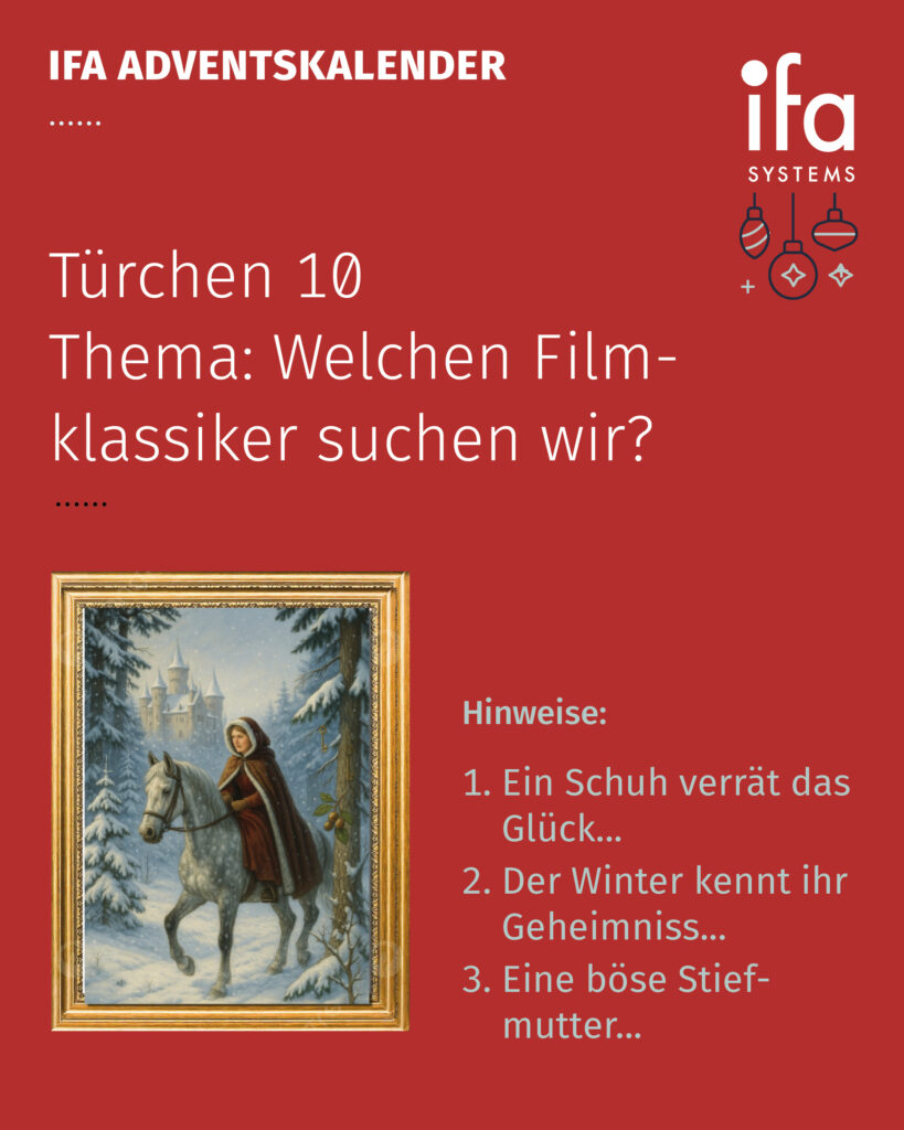 Heute wird’s märchenhaft! Hinter Türchen 10 verbirgt sich ein kleines Filmrätsel, das viele von uns seit Kindheitstagen begleitet. Mit drei Hinweisen möchten wir Sie auf die richtige Spur bringen – erkennen Sie den Weihnachtsklassiker?